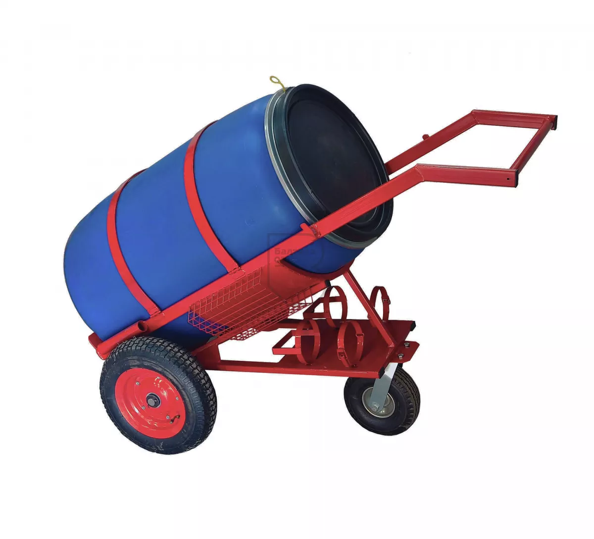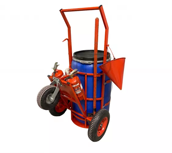 Пост представляет собой тележку для размещения и перемещения на ней ручного пожарного инвентаря (лом, лопата, ведро, два огнетушителя, противопожарное полотнище), а также емкости (пластиковая бочка объемом 227л. с крышкой) к месту возгорания очага.